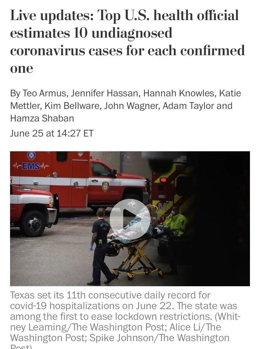得州因Covid-19住院的人数增加到4389人,创下该州又一历史新高。而在星期二进行的冠状病毒检测中,检测结果阳性率超过10%,此前5月26日该比例本已经降到4.27%的低点。为了应对情况的变化,德州州长Greg Abbott周四暂停了重新开放计划。州长还发布了一项行政命令,要求德克萨斯州四个县(包括休斯敦,奥斯丁,达拉斯和圣安东尼奥市)的所有医院停止不必要的手术,以应对越来越多的因冠状病毒住院的患者。该命令将于星期五晚上生效。