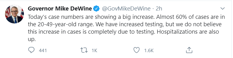 俄亥俄州州长Mike DeWine称,俄州60%的新确诊人数来自20-49岁年龄段的人。