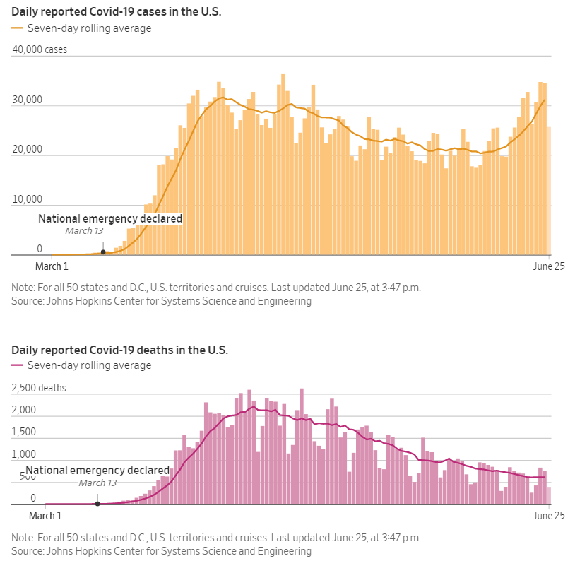 最近全美Covid-19确诊人数遭遇反弹,与此同时死亡人数上暂时没有出现显著的增加。这恐怕与新一波感染的主力为年轻人,而年轻人的新冠死亡率低有关系。