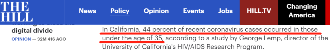 这一轮反扑很大原因来自于年轻人被感染人数的激增,加州超过44%的新确诊人数来自35岁以下的人群。